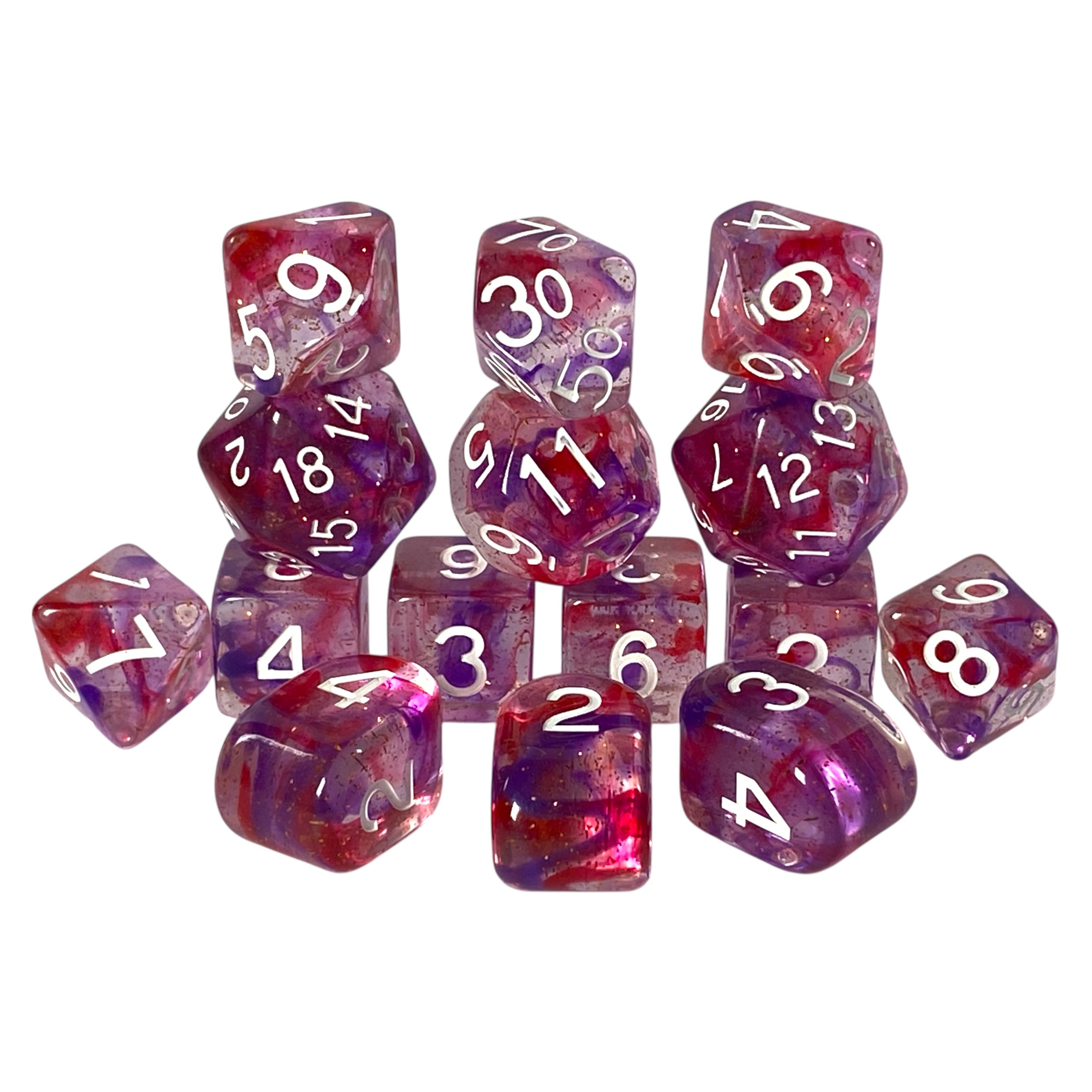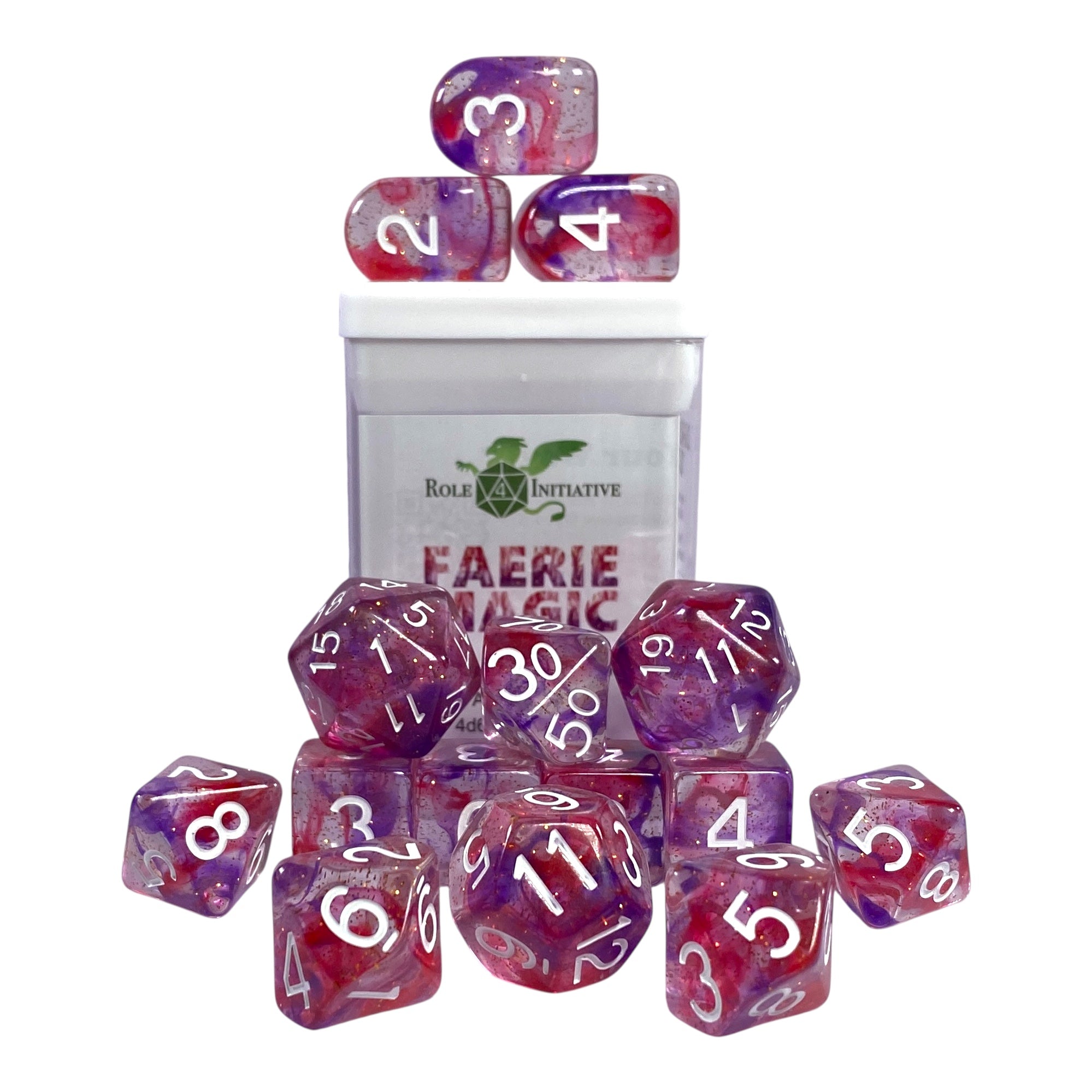 Large High-Visibility Polyhedral Dice: Diffusion™ Faerie Magic (fairy) w/ glitter - diffused red and purple with gold glitter and white numbers