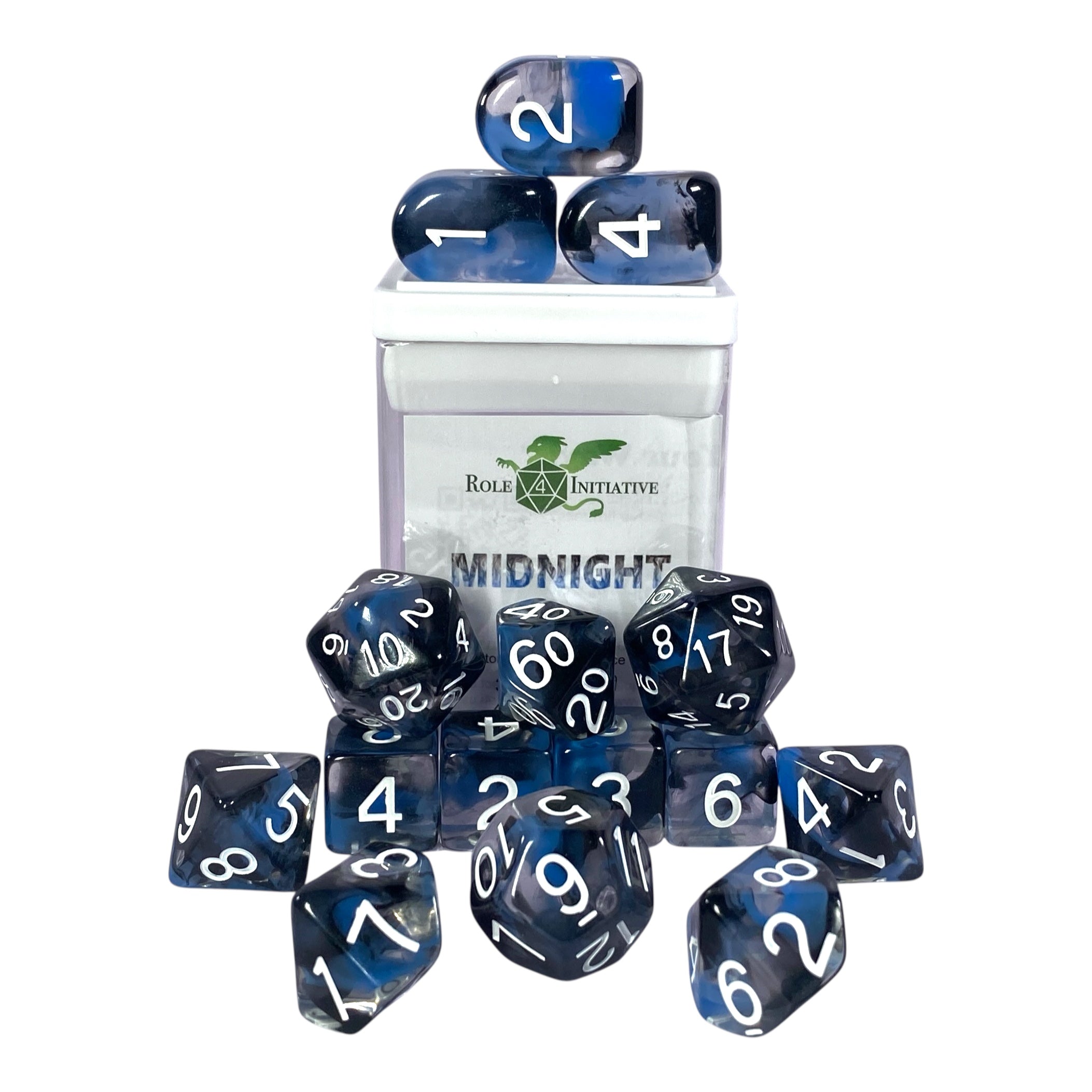 Large High-Visibility Polyhedral Dice: Diffusion Midnight - diffused blue and black w/ white numbers