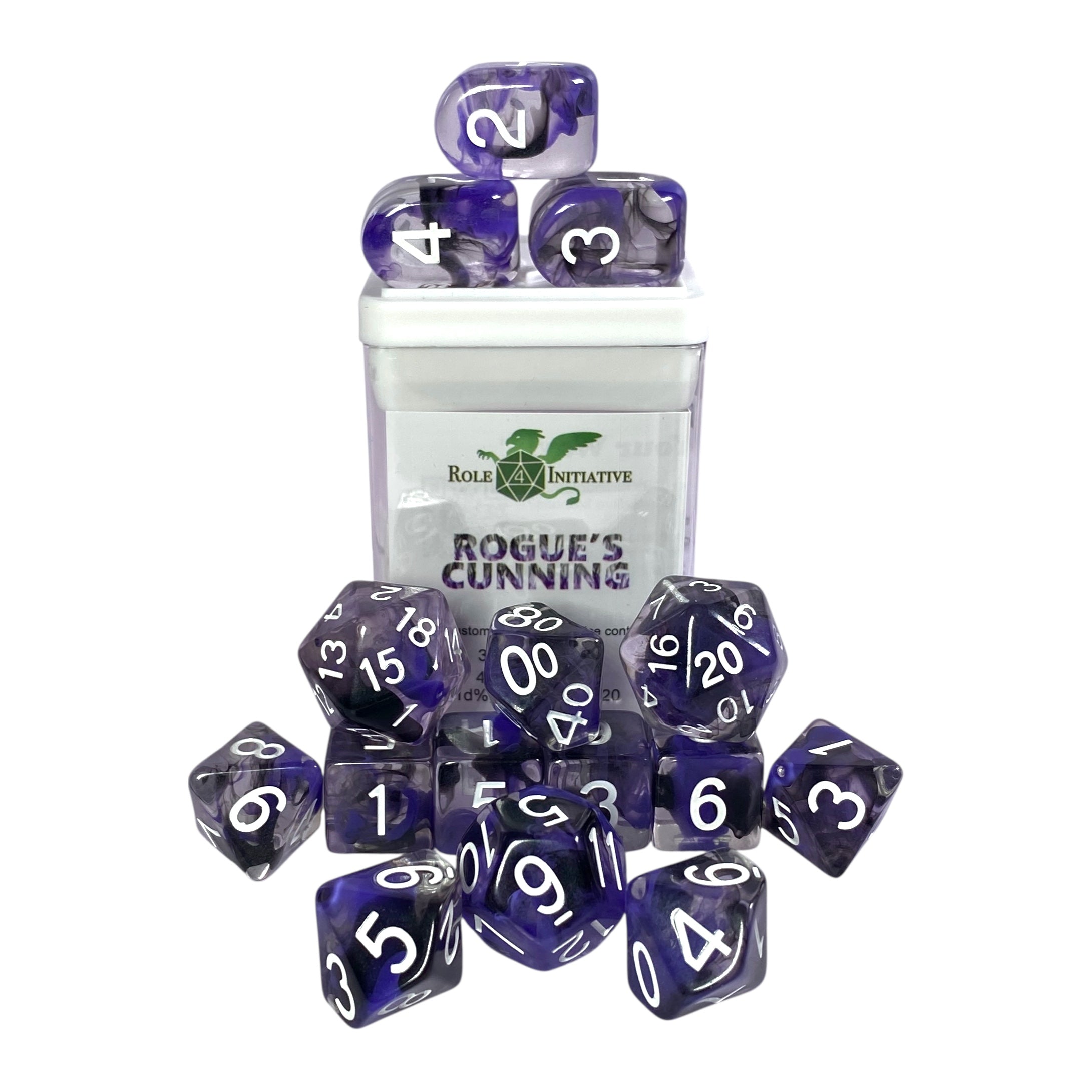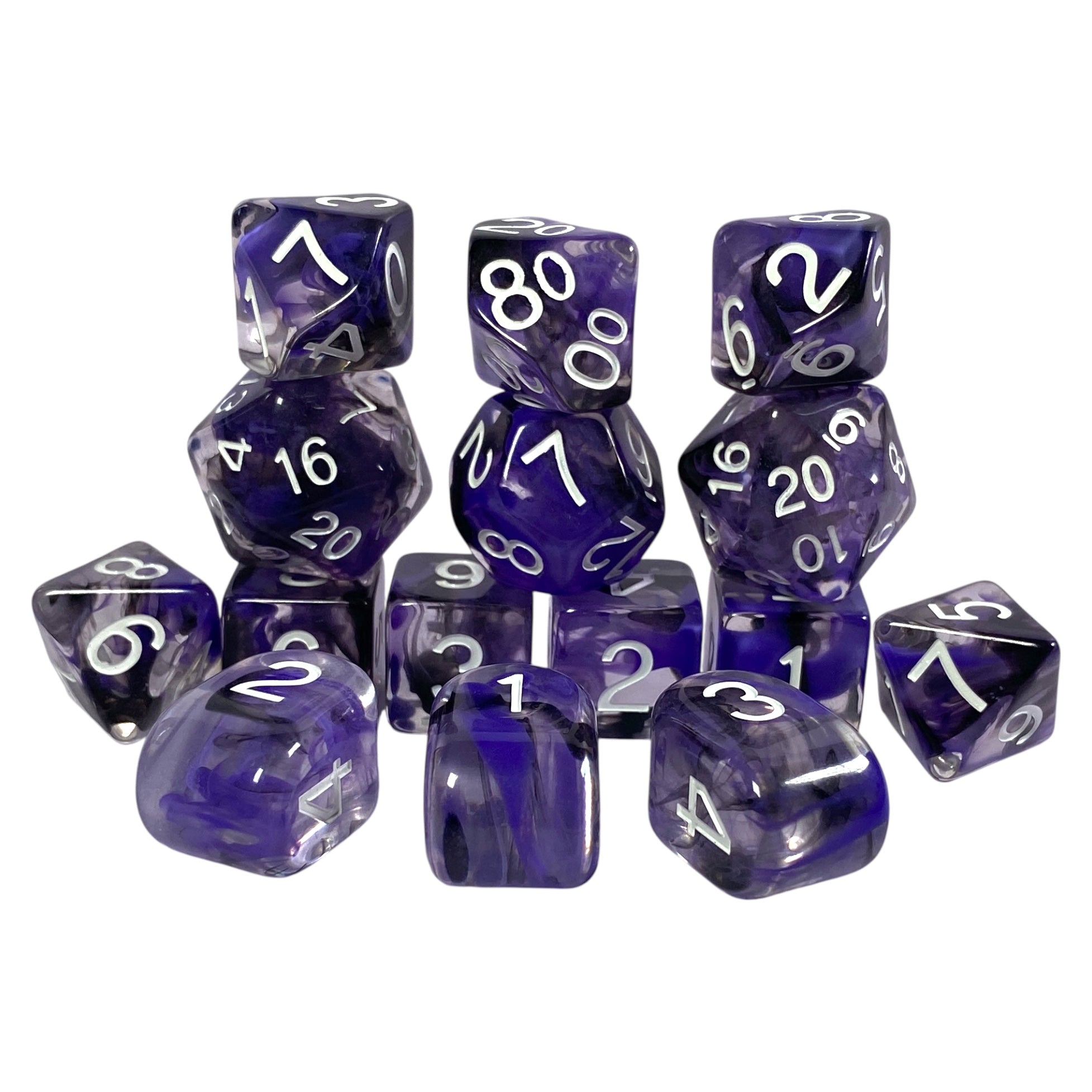 Large high-visibility game dice: Diffusion Rogue's Cunning - Set of 15 w/ all numbers - diffused purple and black w/ white numbers