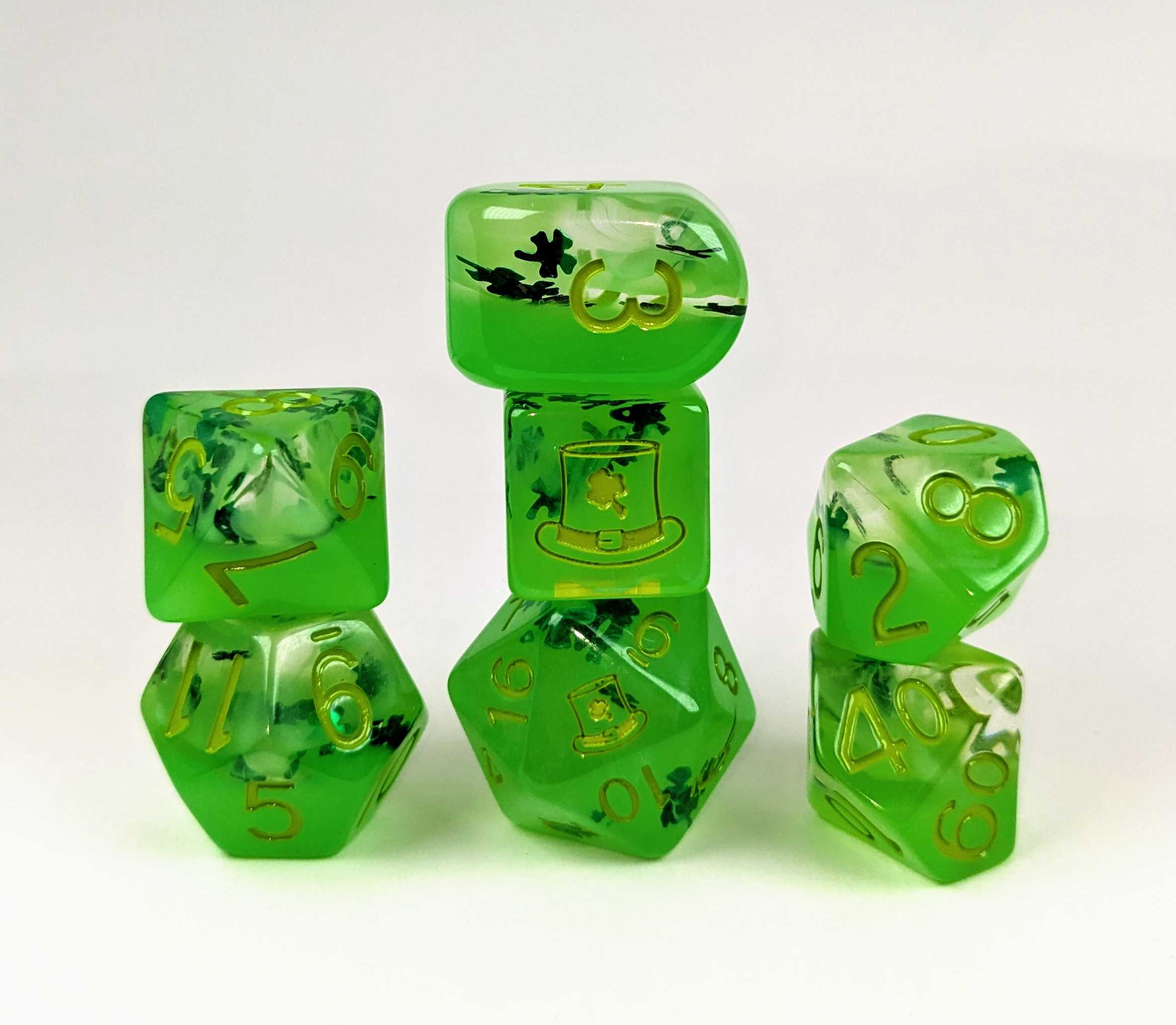 Large high-visibility game dice: Diffusion™ Lit Leprechaun, our 1st glow-in-the-dark offering! A new addition to our Holi-Dice collection, these dice have a vibrant bottom layer of opaque green with glow-in-the-dark powder, and the top layer has diffused Green with Green Clover foil inclusions, with pale green numbers, and the leprechaun hat symbol on the d6 and Balance'd20.