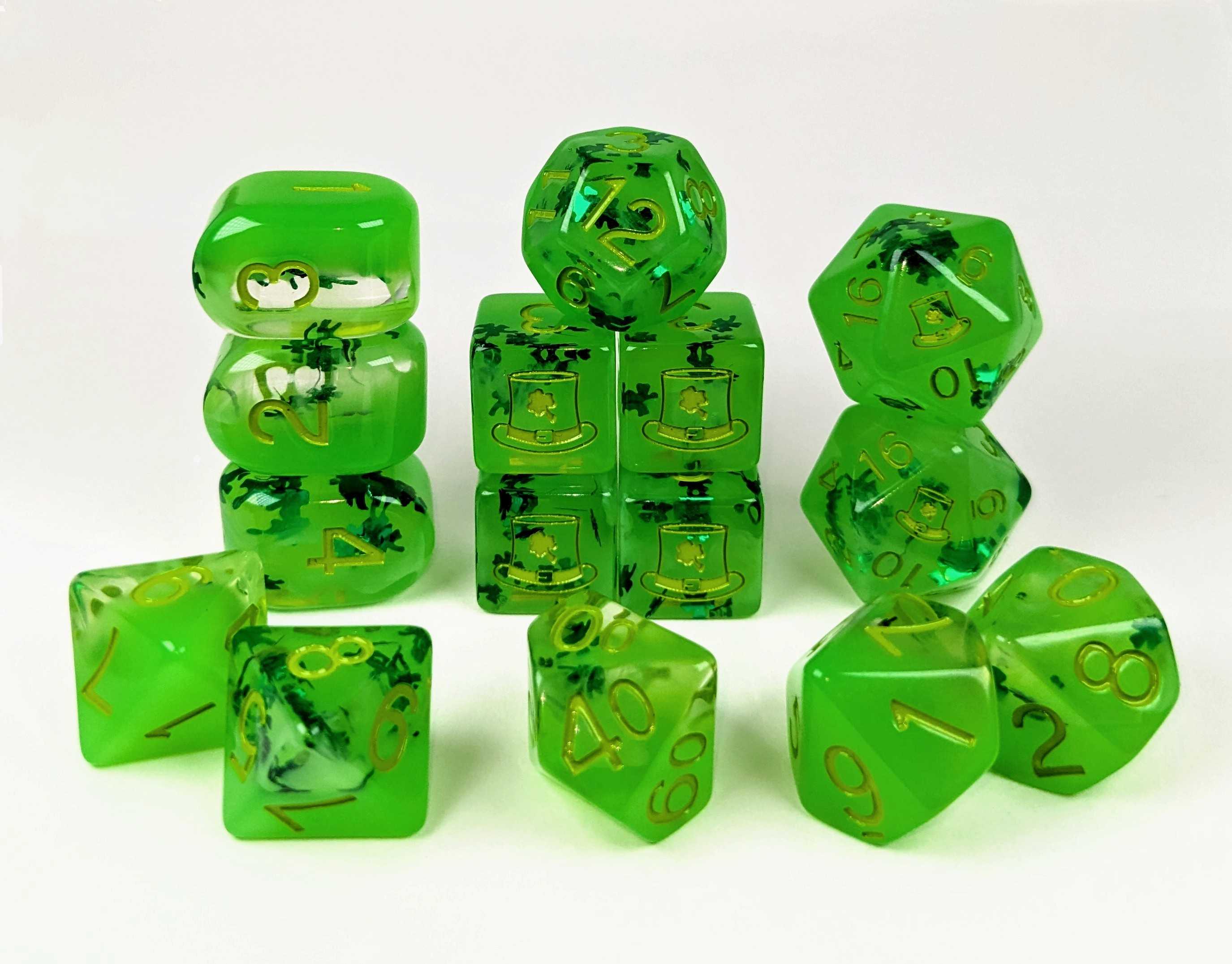 Large high-visibility game dice: Diffusion™ Lit Leprechaun, our 1st glow-in-the-dark offering! A new addition to our Holi-Dice collection, these dice have a vibrant bottom layer of opaque green with glow-in-the-dark powder, and the top layer has diffused Green with Green Clover foil inclusions, with pale green numbers.