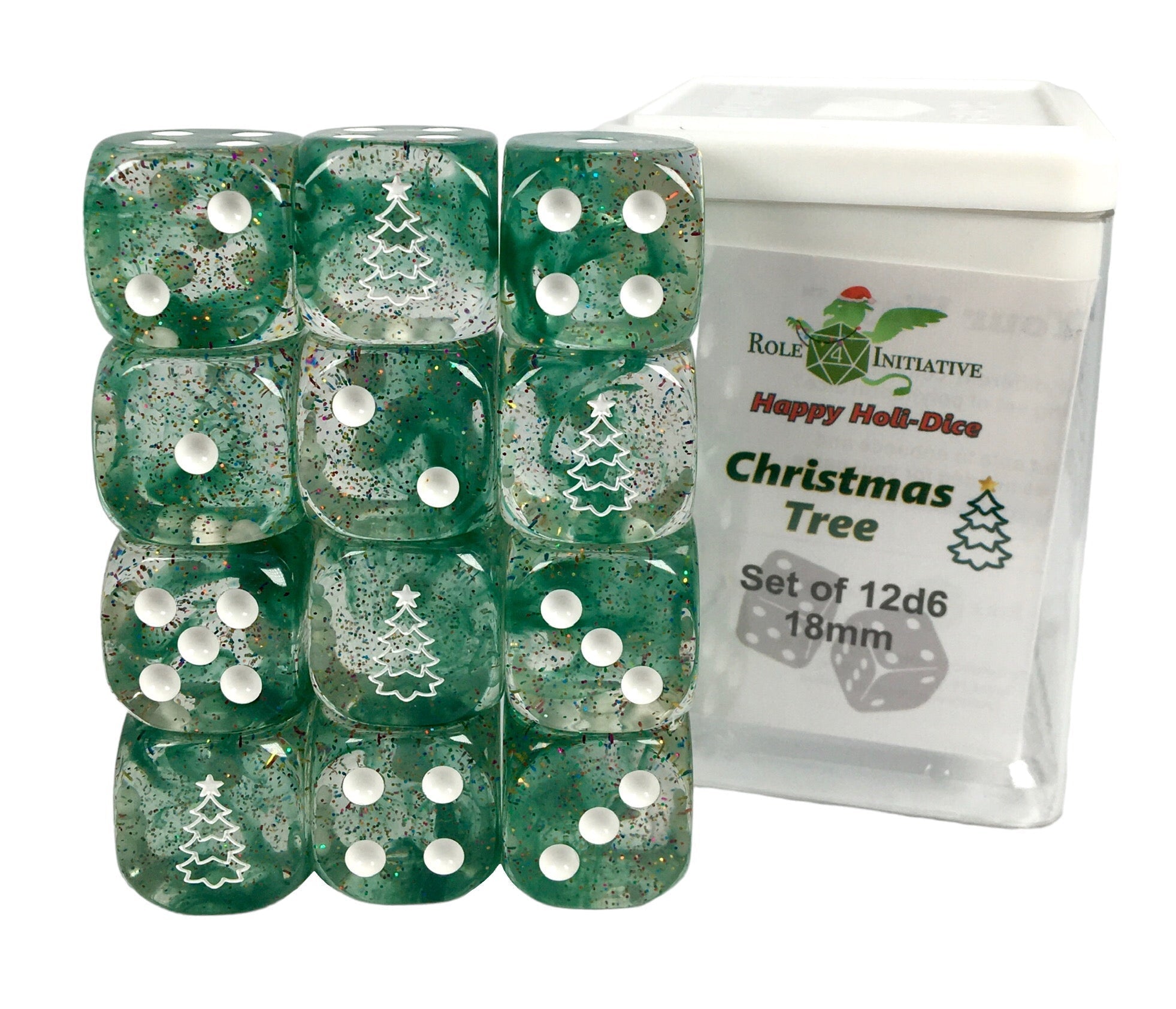 Set of 12 d6 with pips (18mm) in Christmas Tree (Diffusion). Make a hefty roll with these larger d6, over 40% larger than typical 16mm dice.