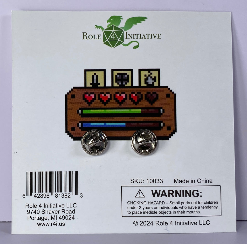 This 2"-wide printed enamel pin depicts a character stat bar showing your health, stamina, and magic levels--and a few action hotkeys, of course--in a retro video game pixel style. Never let an enemy catch you unprepared with this helpful status keeper!