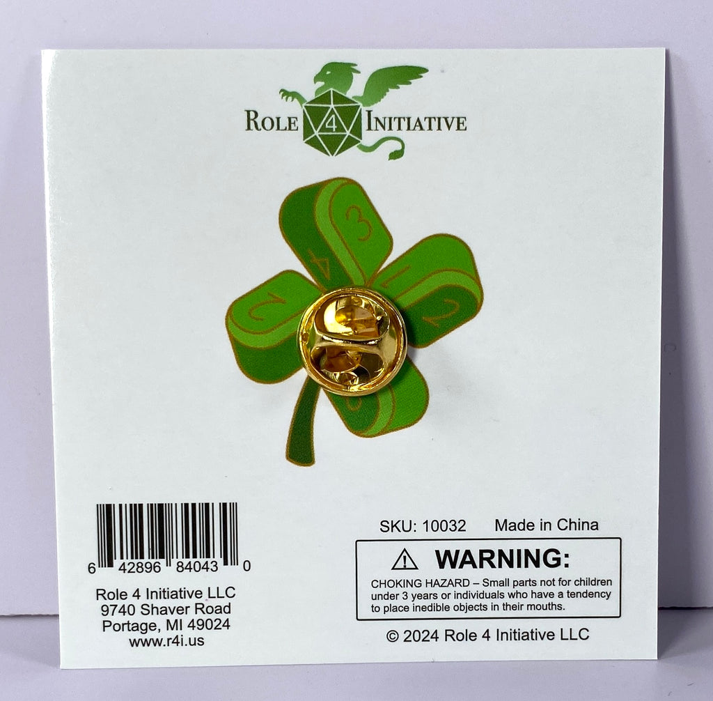 This 1.5"-tall glittering enamel pin depicts a lucky four leaf clover, featuring the shape of the Role 4 Initiative Arch'd4! The green hues sparkle the whole design over with iridescent glitter. Wear this pin to bring good fortune in all your dice rolling ventures.