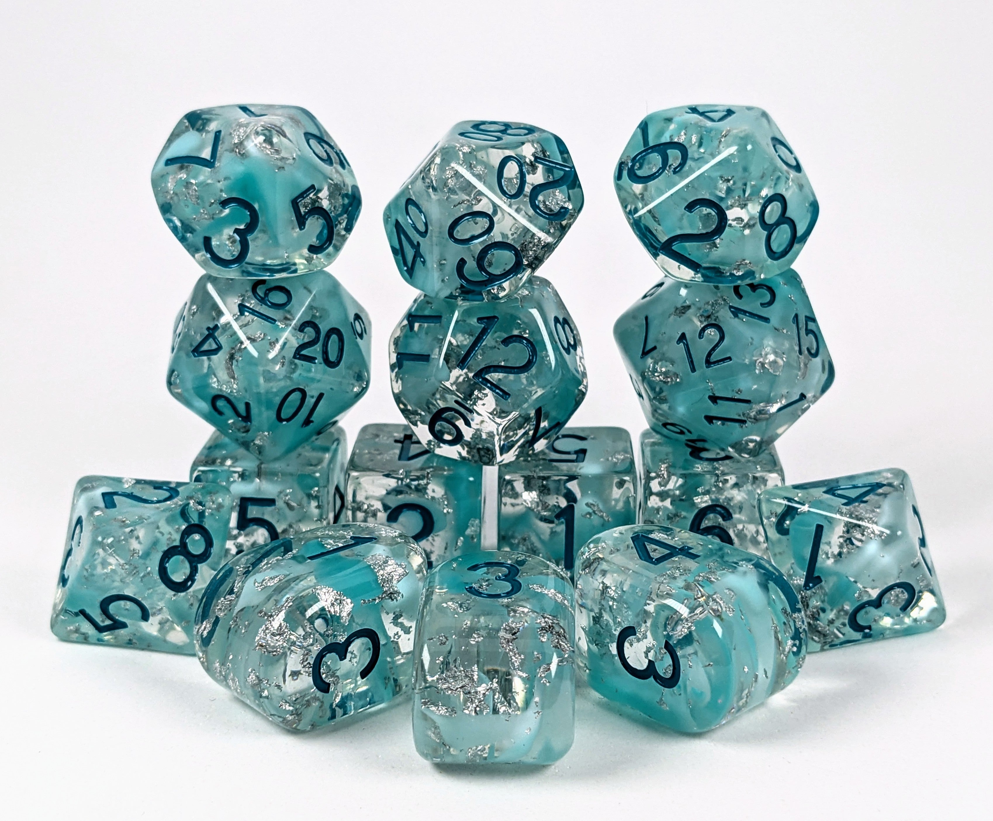 Large high-visibility game dice: Diffusion™ Arctic Blast is a dazzling duo of diffused aqua tones with silver foil and dark aqua numbers. As breathtaking as the icy winds from where they get their name.