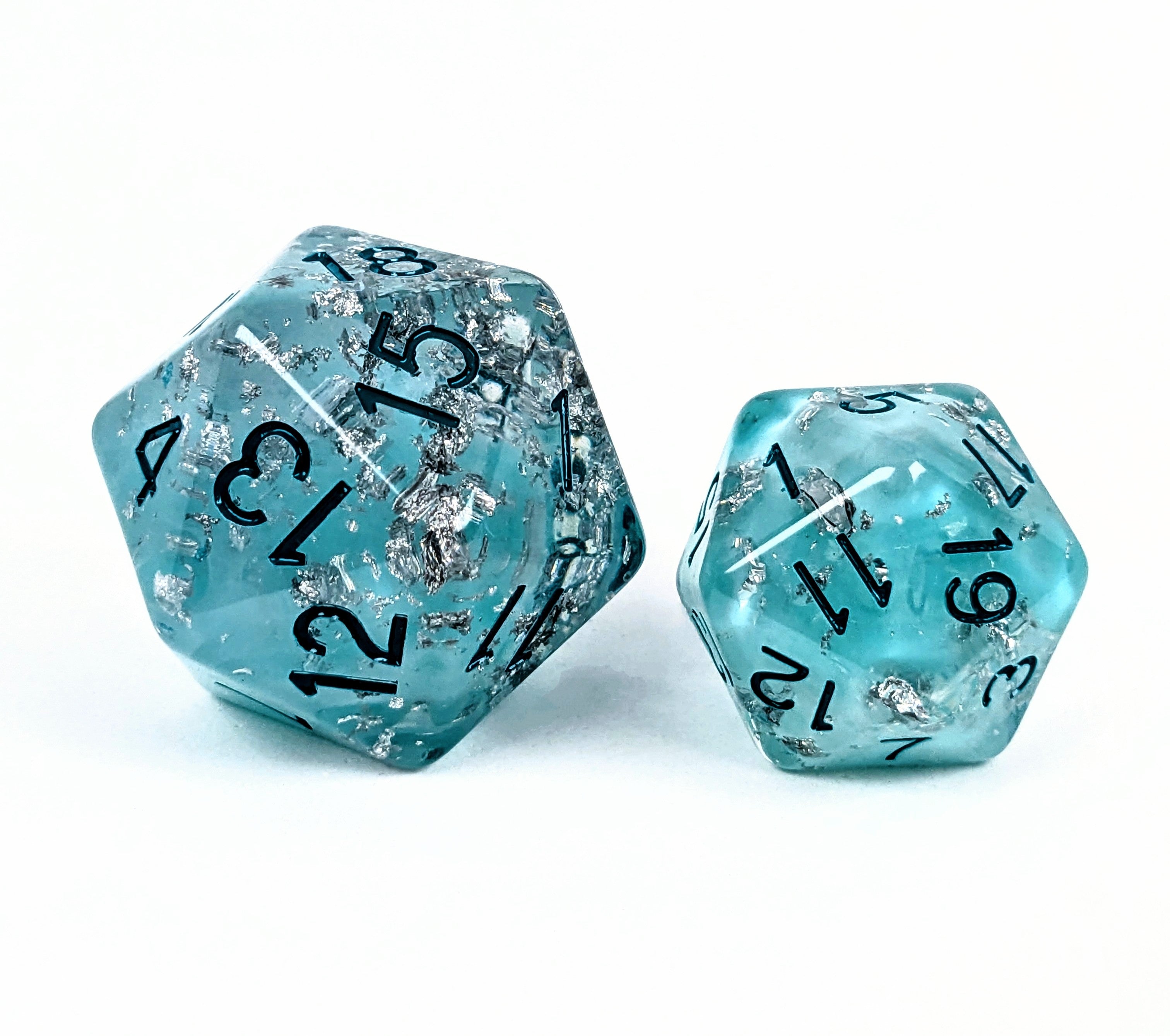Large high-visibility game dice: Diffusion Arctic Blast is a dazzling duo of Diffused aqua tones with silver foil and dark aqua numbers. As breathtaking as the icy winds from where they get their name. Grab one of these XLd20s for that big monster roll!