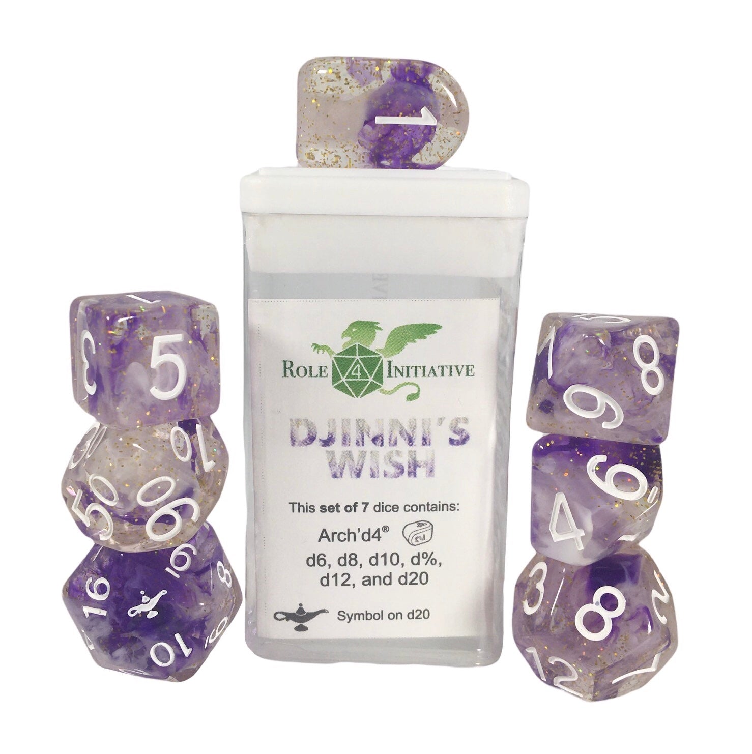 Large high-visibility game dice: Diffusion Djinnis Wish - Set of 7 w/ symbols - diffused blue and purple w/ silver glitter