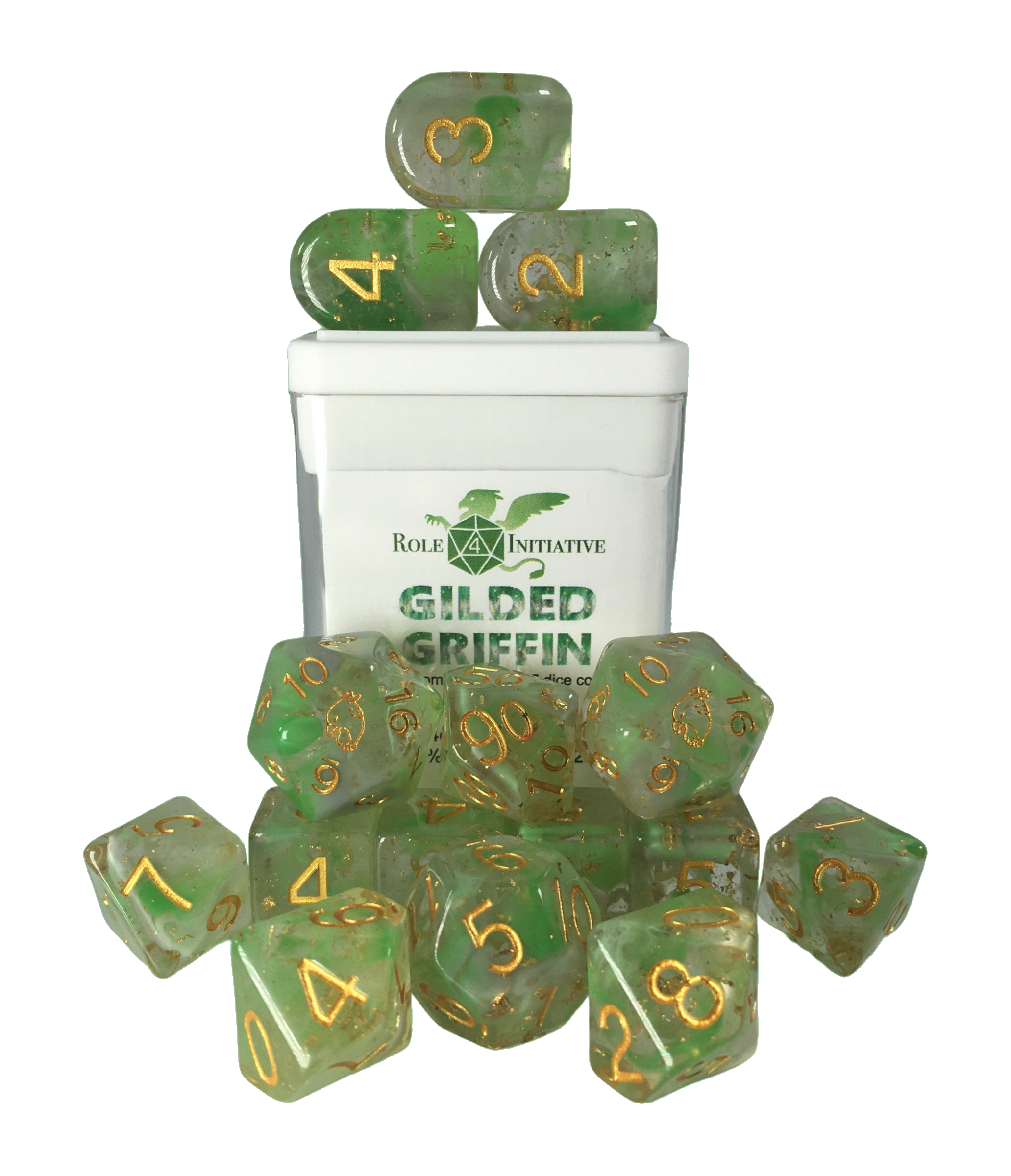 Large high-visibility game dice: Diffusion Gilded Griffin - Set of 15 w/ all numbers - diffused dark green, light green & light gray w/ gold foil and metallic gold ink