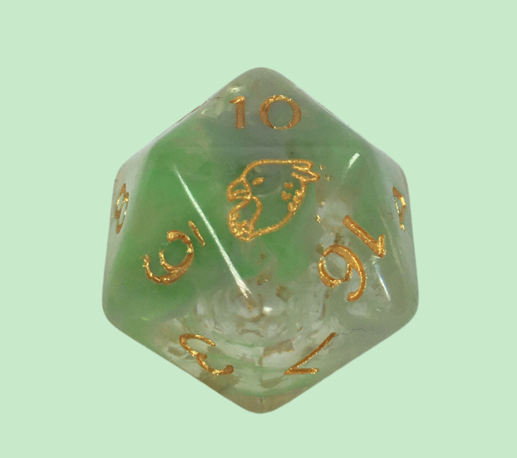Large high-visibility game dice: Gilded Griffin - diffused dark green, light green & light gray w/ gold foil and metallic gold numbers.