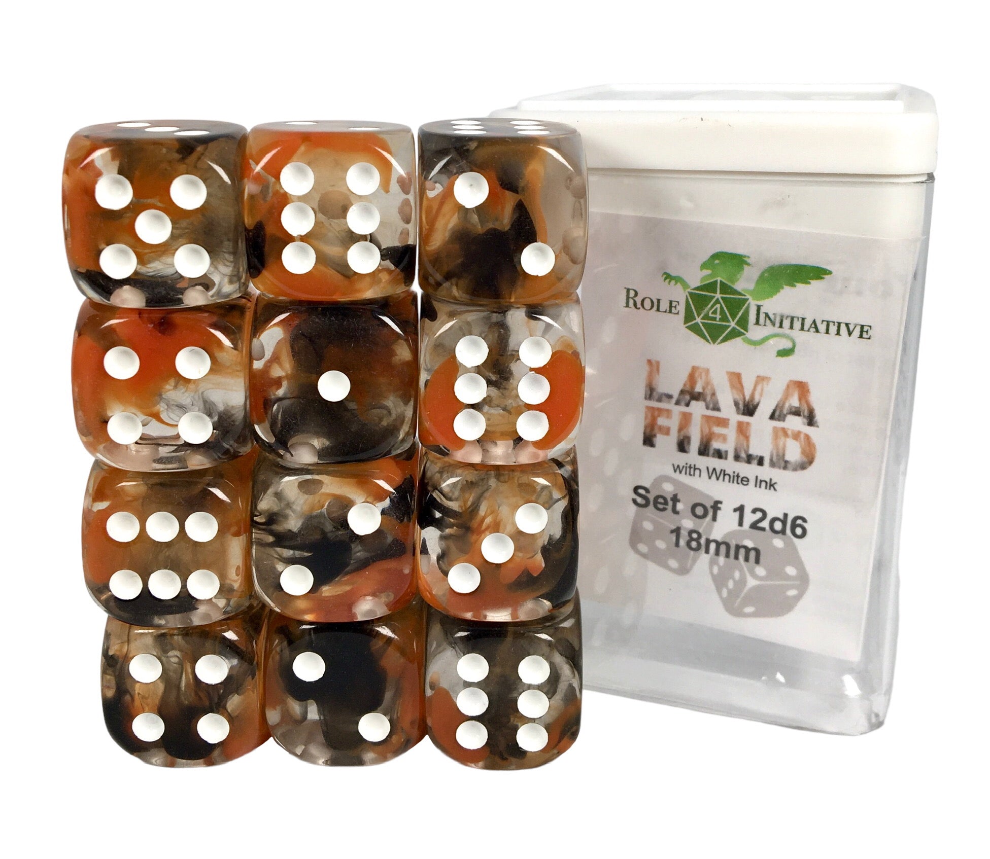 This set of 12 dice contains 12 18mm d6 w/ pips.