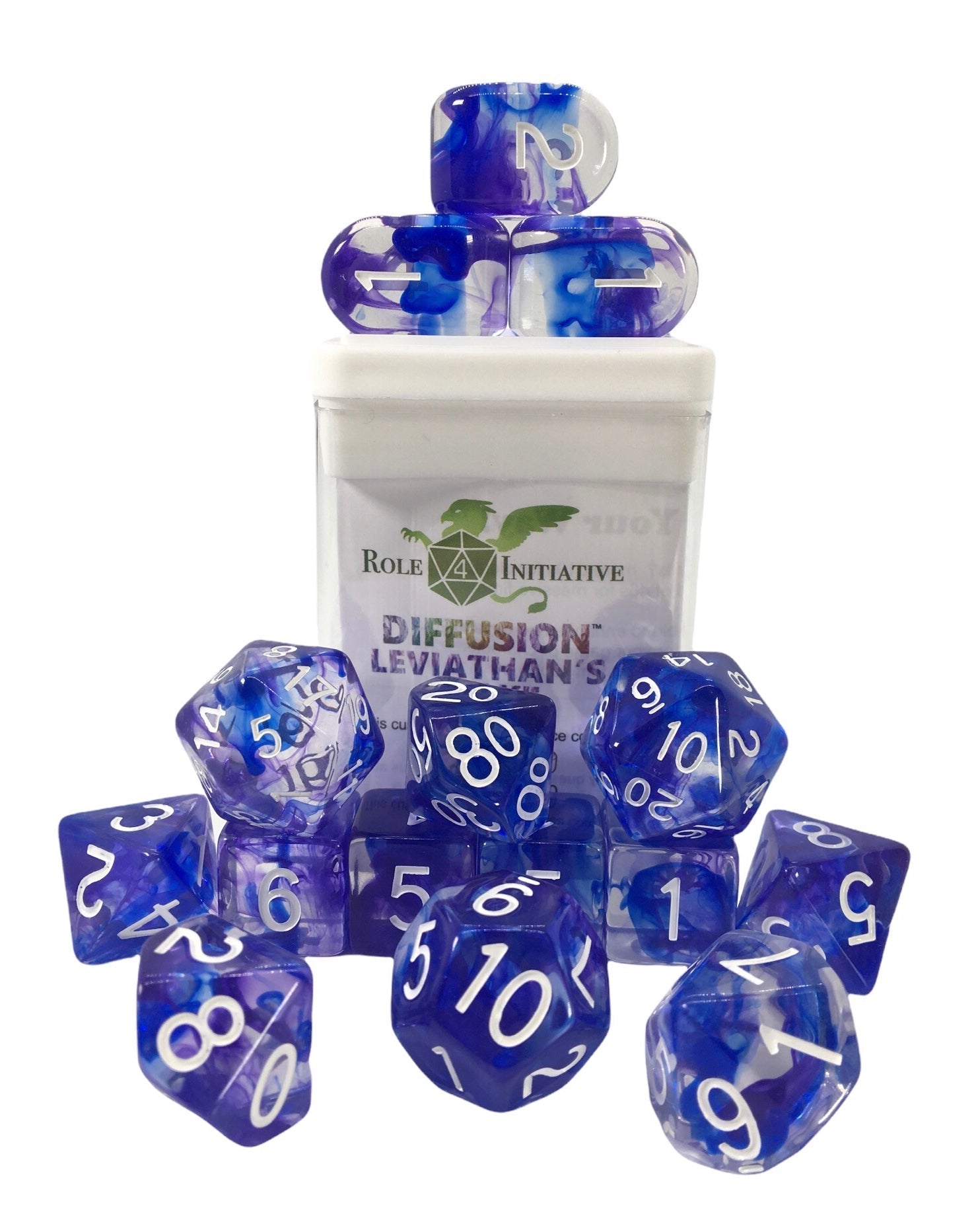Large high-visibility game dice: Diffusion Leviathan's Wake - Set of 15 w/ all numbers - diffused blue and purple w/ white ink