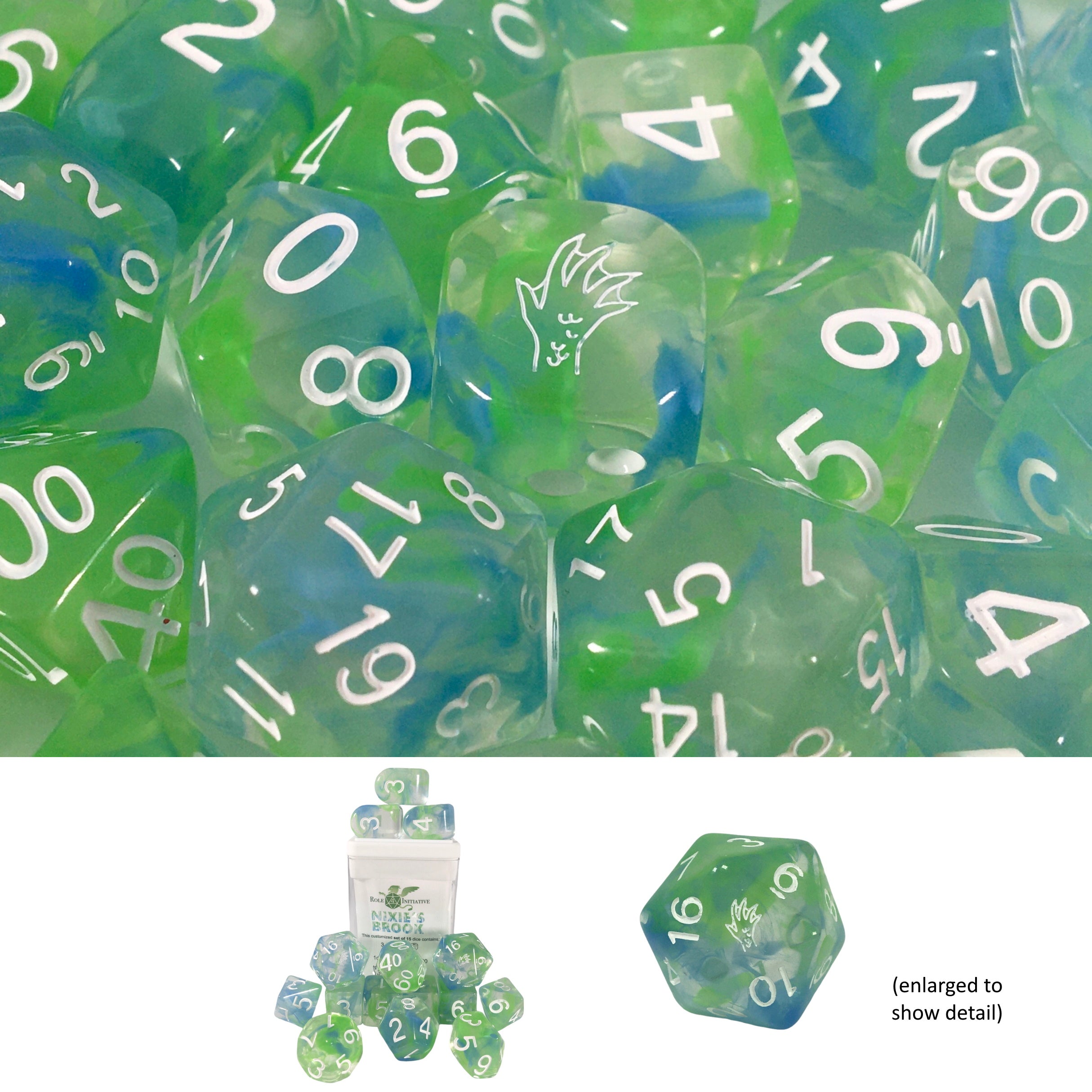 Large high-visibility game dice: Diffusion Nixies Brook - Set of 15 w/ symbols - diffused light green and blue w/ white ink