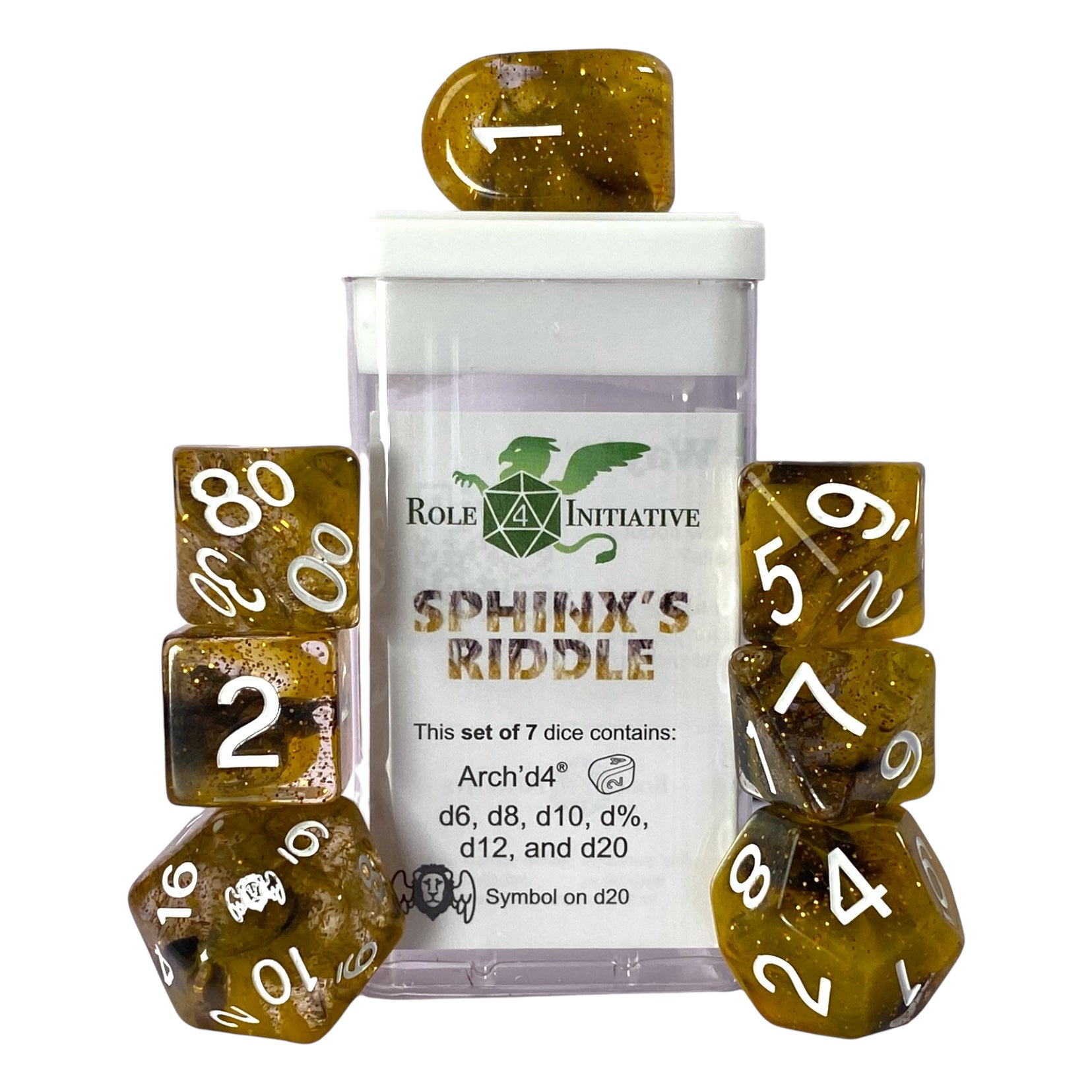 Large high-visibility game dice: Diffusion Sphinx's Riddle - Set of 7 w/ symbols - diffused gold and black w/ gold glitter & white ink