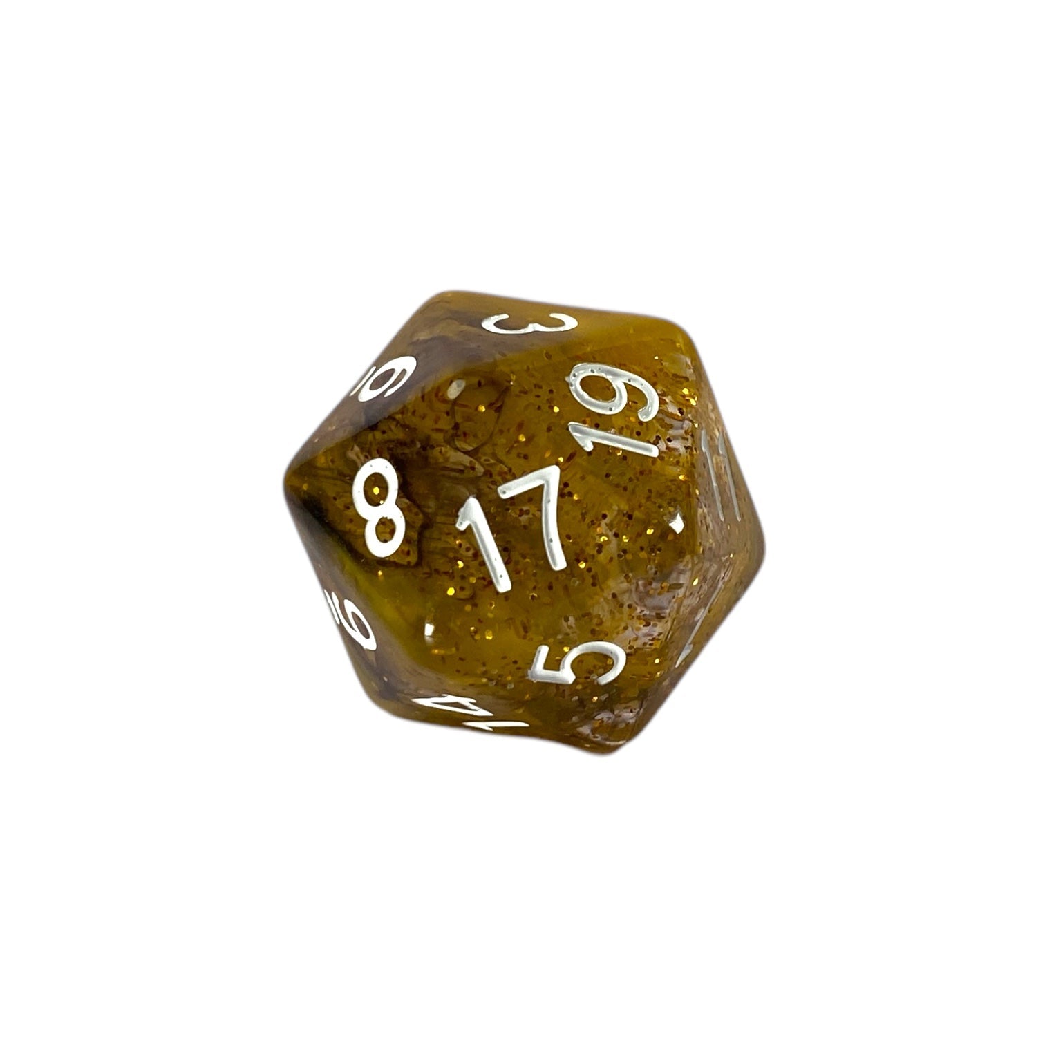Large High-Visibility Polyhedral Dice: Diffusion Sphinx's Riddle - diffused black and gold w/ white numbers and gold glitter.