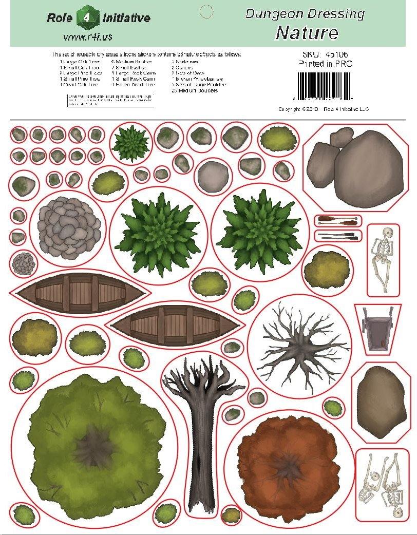 Quickly and easily populate your dungeon map with all sorts of highly detailed and colorful items using Role 4 Initiative's Dungeon Dressing. Each sheet contains dozens of vinyl stickers that are repositionable, reusable, and compatible with both dry- and wet-erase markers so they can be used on any battlemat or set of dungeon tiles.