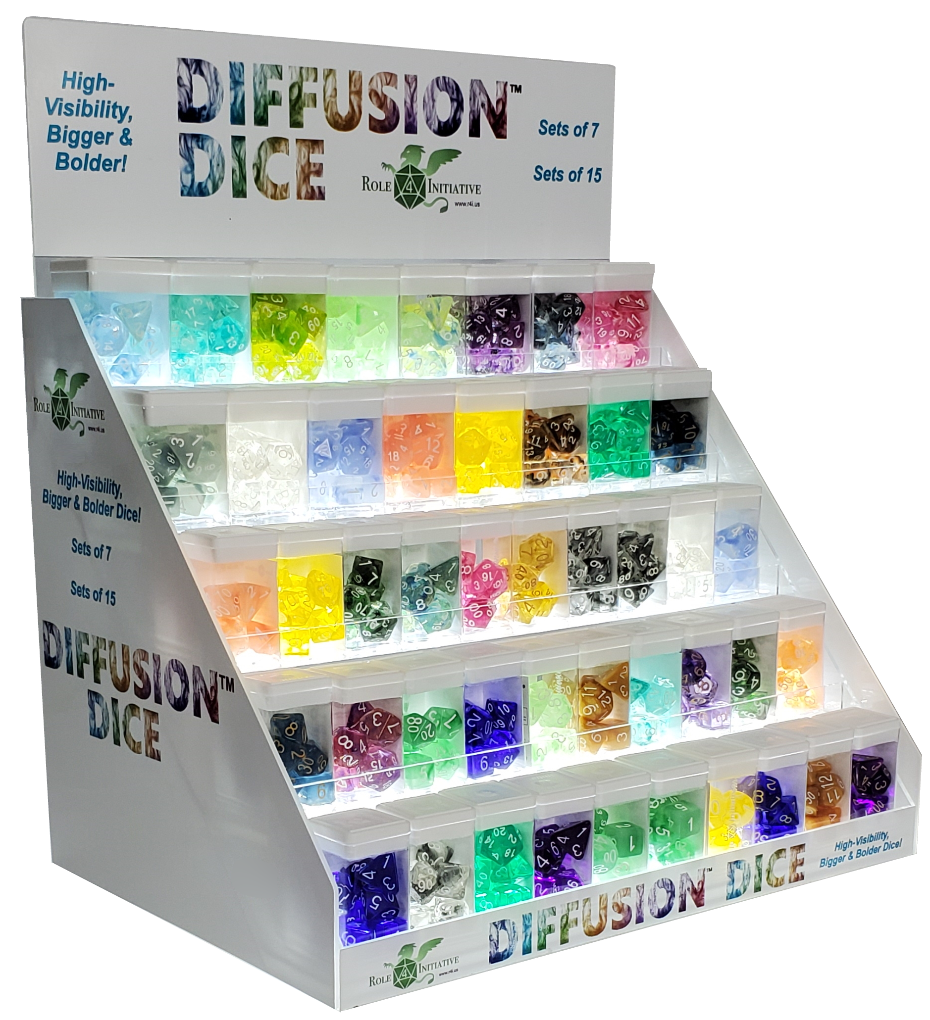 Each shelf holds 10 sets of 7 or 8 sets of 15 dice in our display box packaging. Includes an adjustable AC power supply to vary the brightness and 6' power cord to ensure easy connection to an outlet.