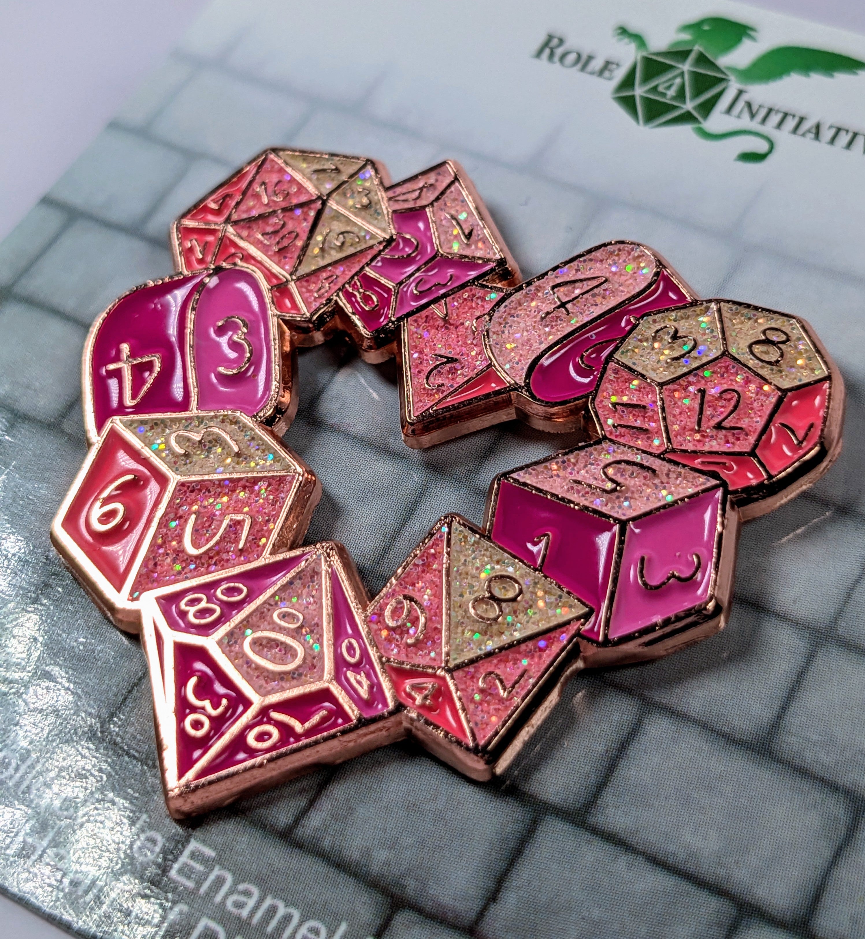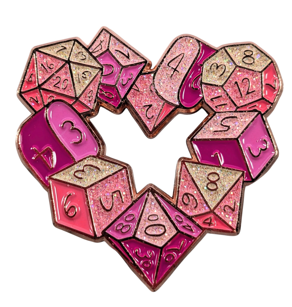 Show your love 💗of dice collecting or gaming with this 1.5" soft enamel multi-colored glittery pin! Literally wear your heart on your dice bag or backpack, or accessorize your clothes or hats!