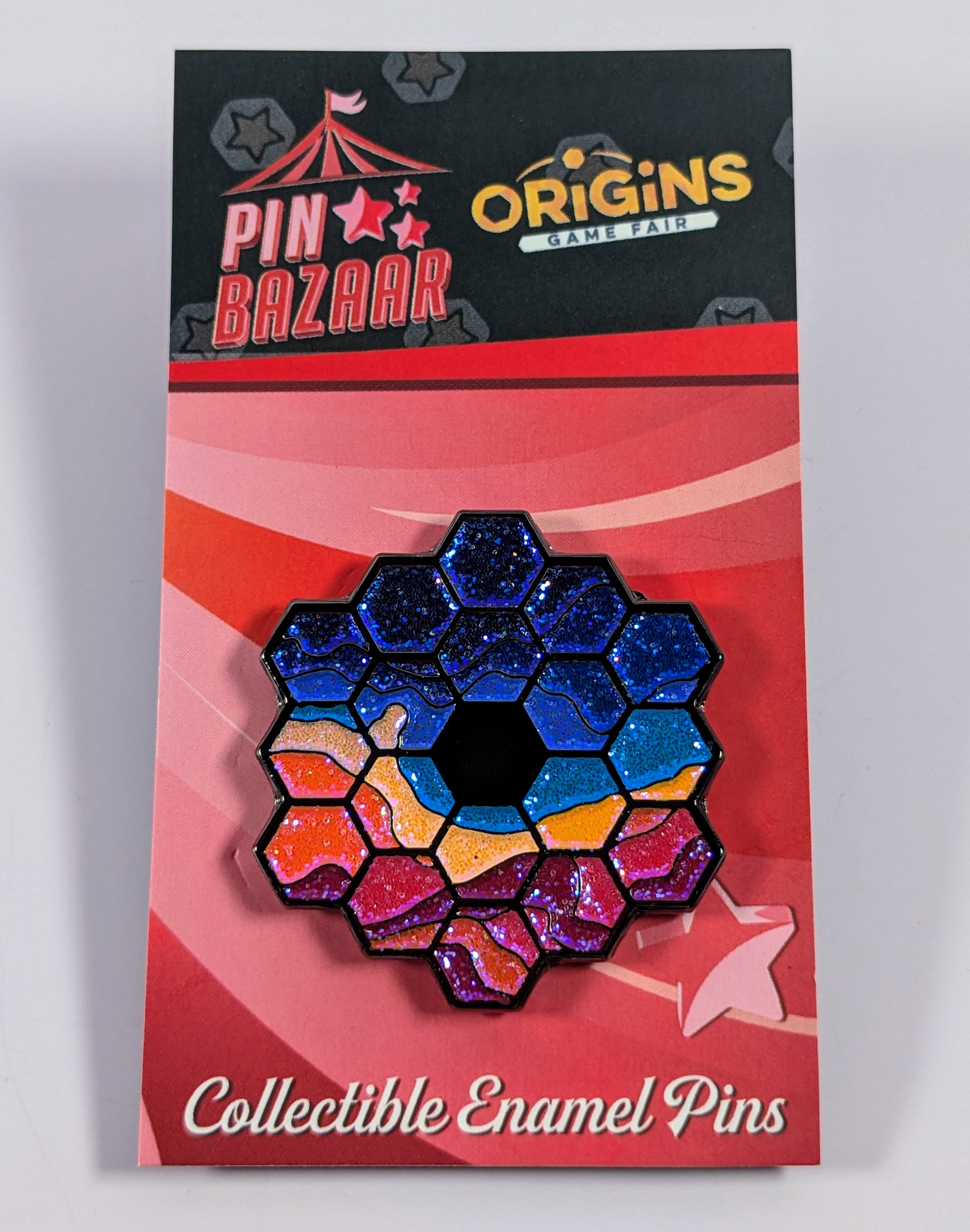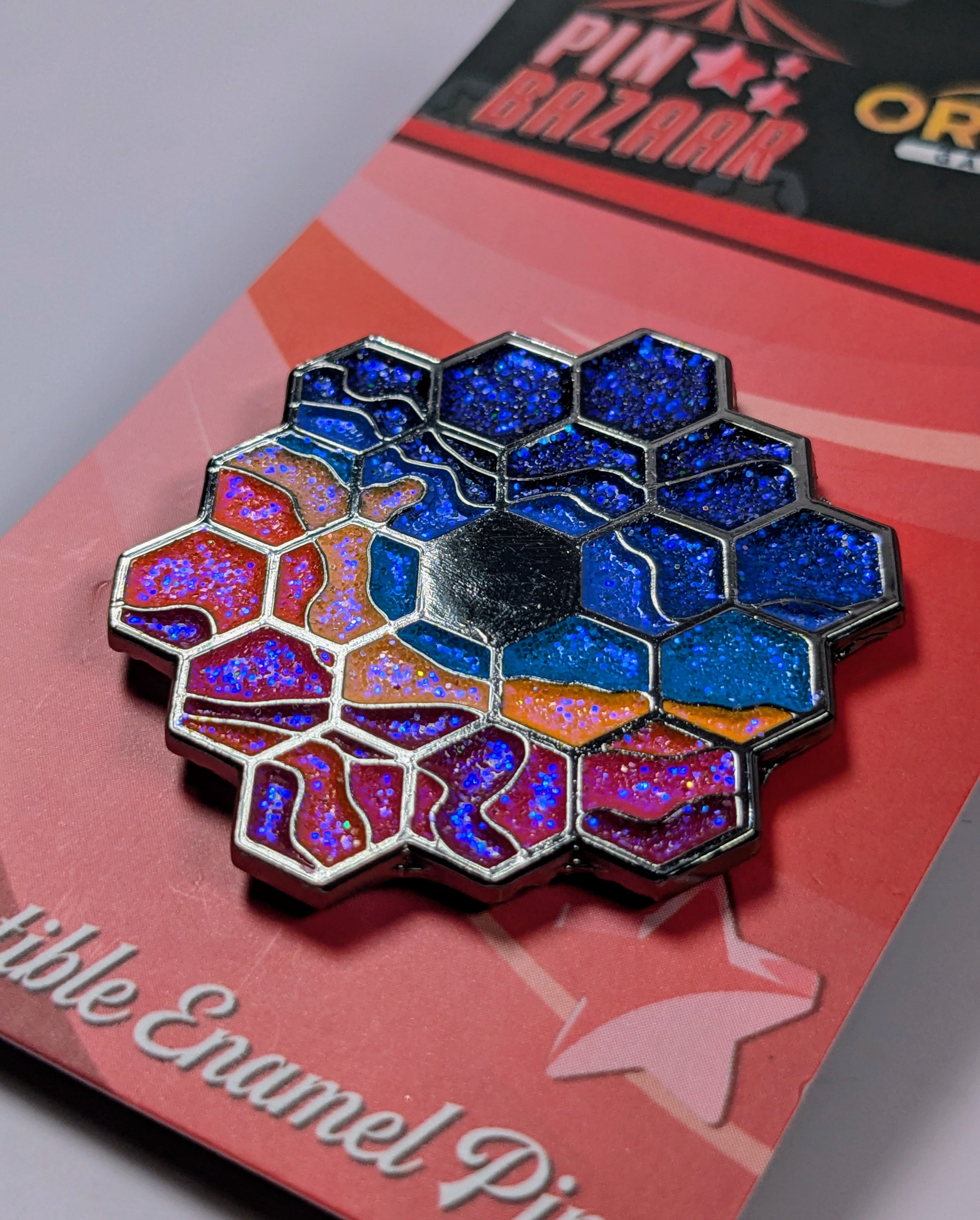 Channel your inner space nerd with our 1.5" pin version of the hexagonal mirror from the James Webb Space Telescope, reflecting the 'Cosmic Cliffs' of the Carina Nebula, one of the brightest and largest in the sky. We also have a dice color named Cosmic Cliffs that corresponds to the famous image taken by this telescope.