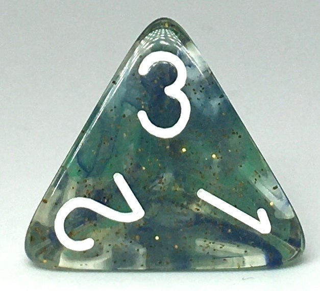 Large high-visibility game dice: Diffusion Neptune's Treasure - diffused blue and green w/ white numbers and gold glitter.