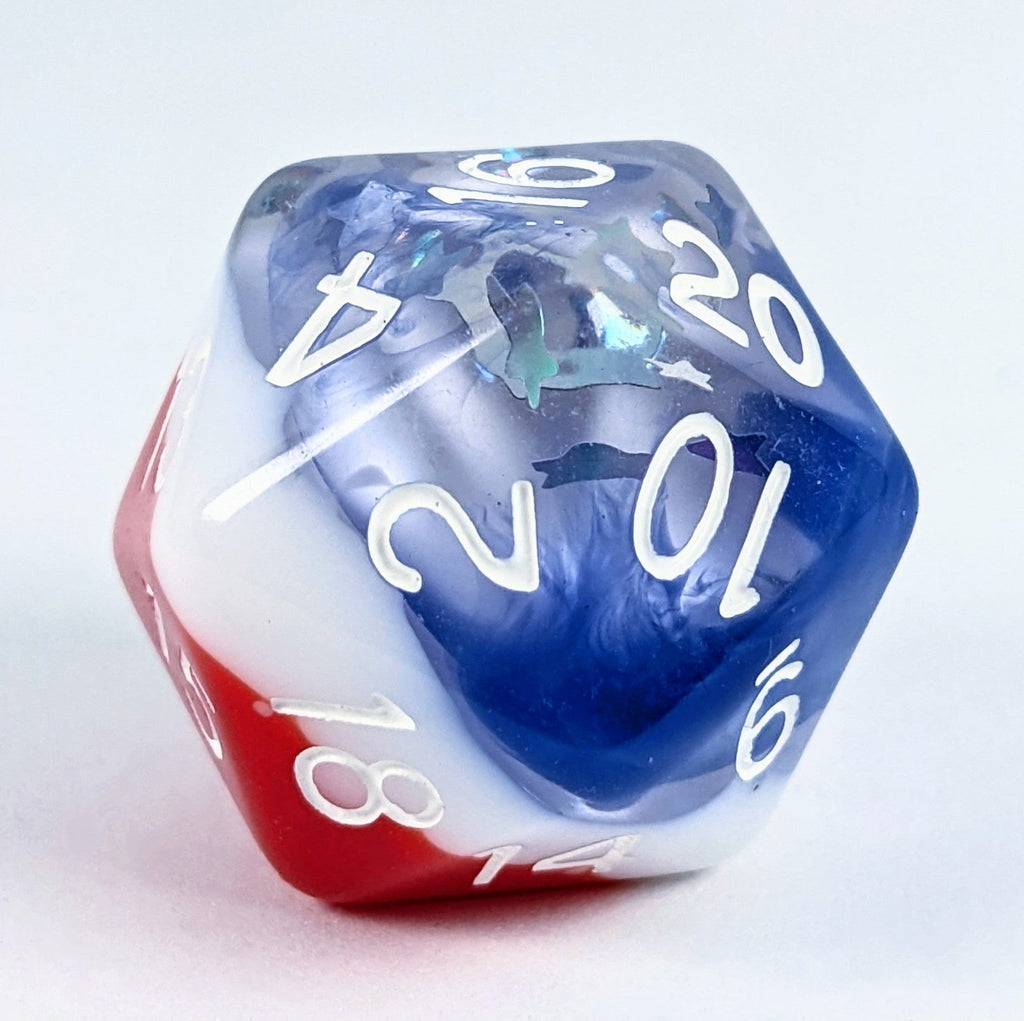 Large high-visibility game dice: A patriotic addition to our Holi-Dice collection: Diffusion Stars & Stripes -- layers of opaque red and white topped with a layer of diffused blue with holographic silver stars, with white numbers. Pledge your allegiance to these beauties!