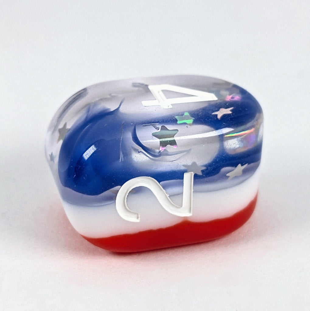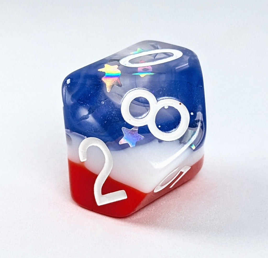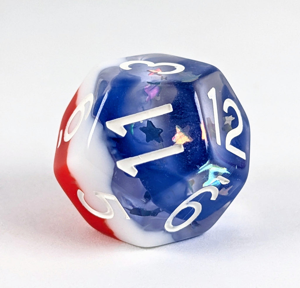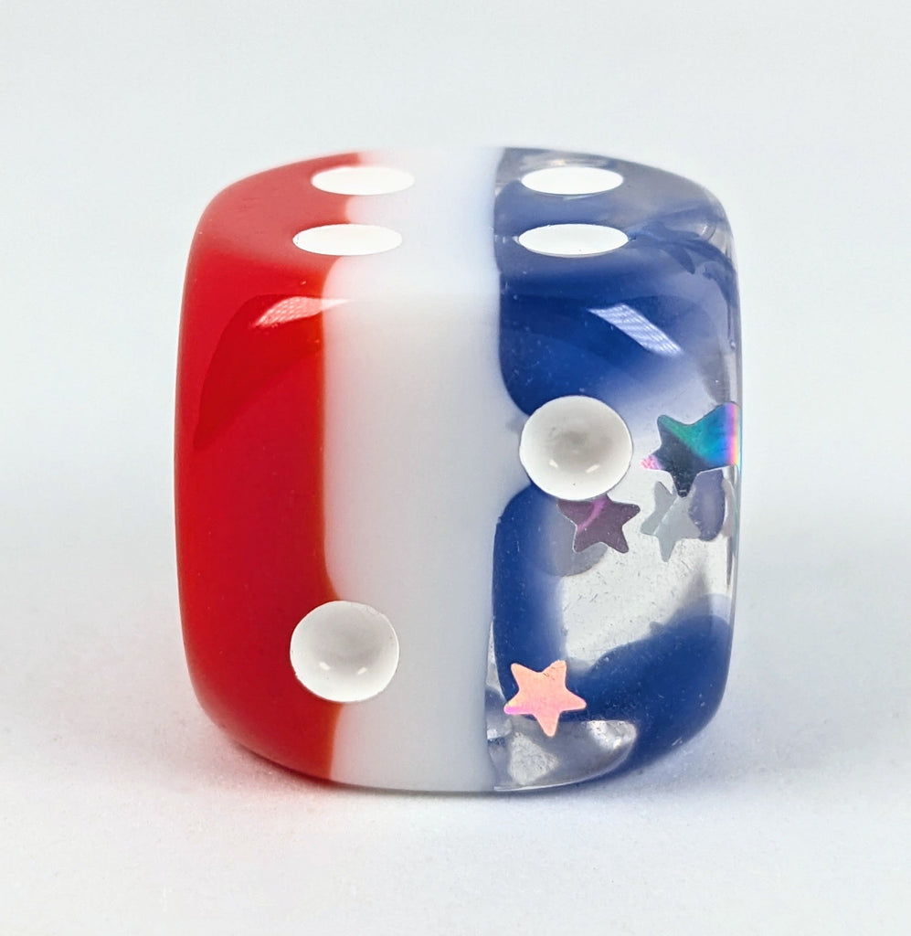 Large high-visibility game dice: A patriotic addition to our Holi-Dice collection: Diffusion Stars & Stripes -- layers of opaque red and white topped with a layer of diffused blue with holographic silver stars, with white numbers. Pledge your allegiance to these beauties!