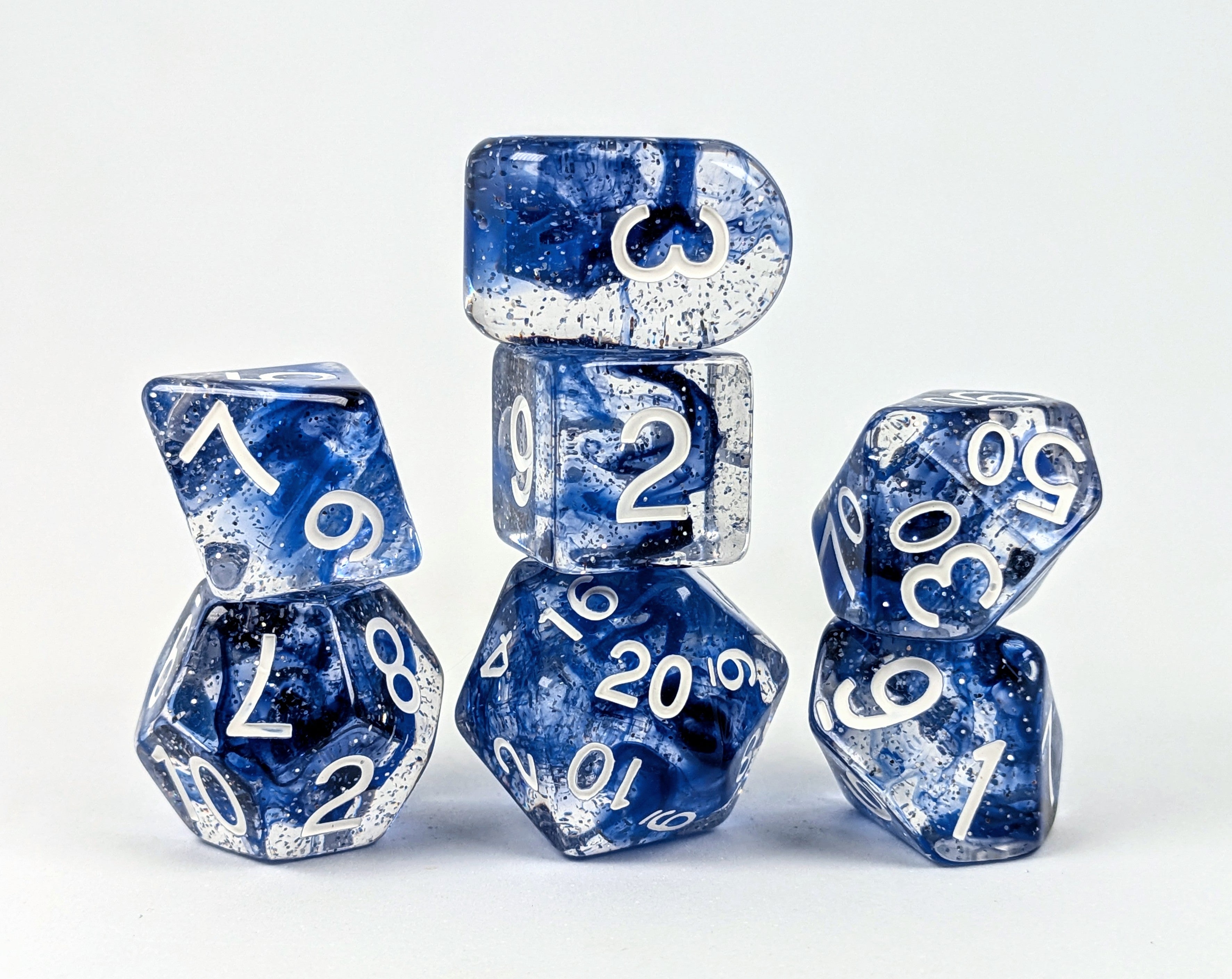 Large high-visibility game dice: Diffusion™ Sunken Silver - a duo of diffused midnight and deep blue with silver glitter and white numbers. A true treasure fit for the pleasure of pirates and dice goblins everywhere!