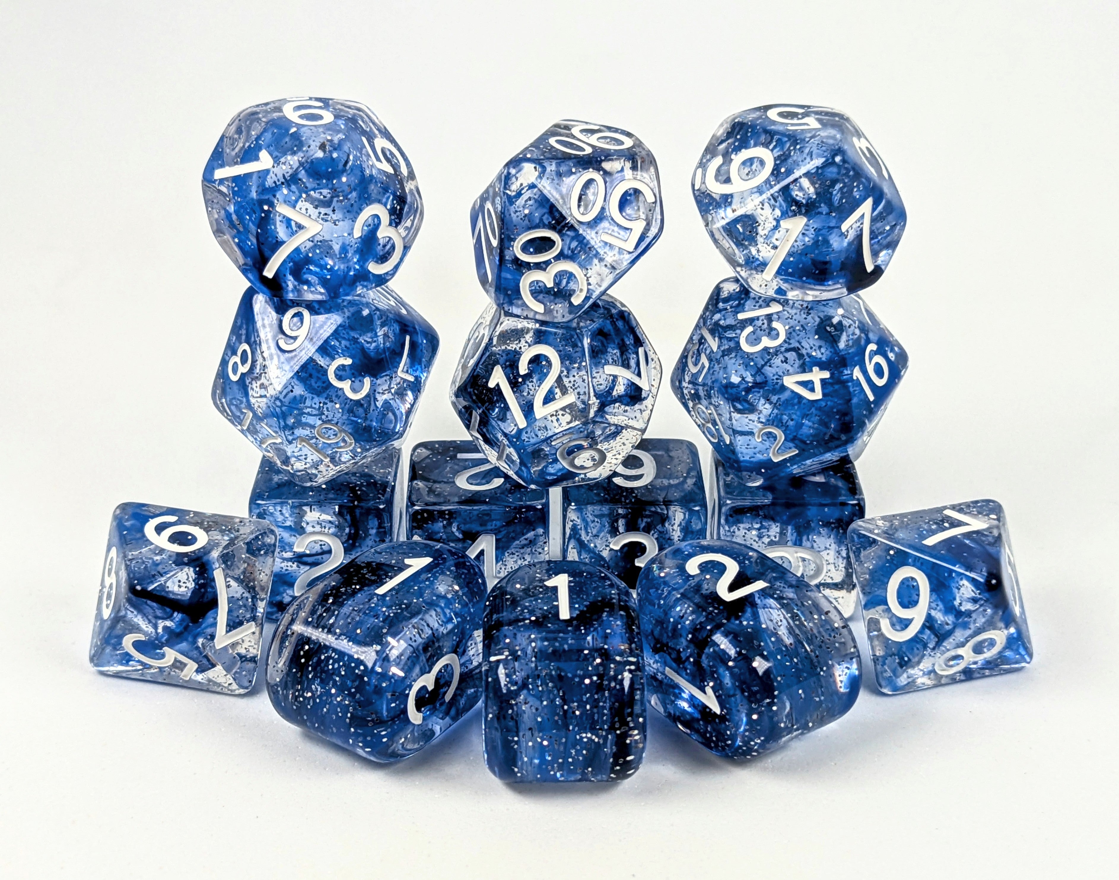 Large high-visibility game dice: Diffusion™ Sunken Silver -- a duo of diffused midnight and deep blue with silver glitter and white numbers. A true treasure fit for the pleasure of pirates and dice goblins everywhere!