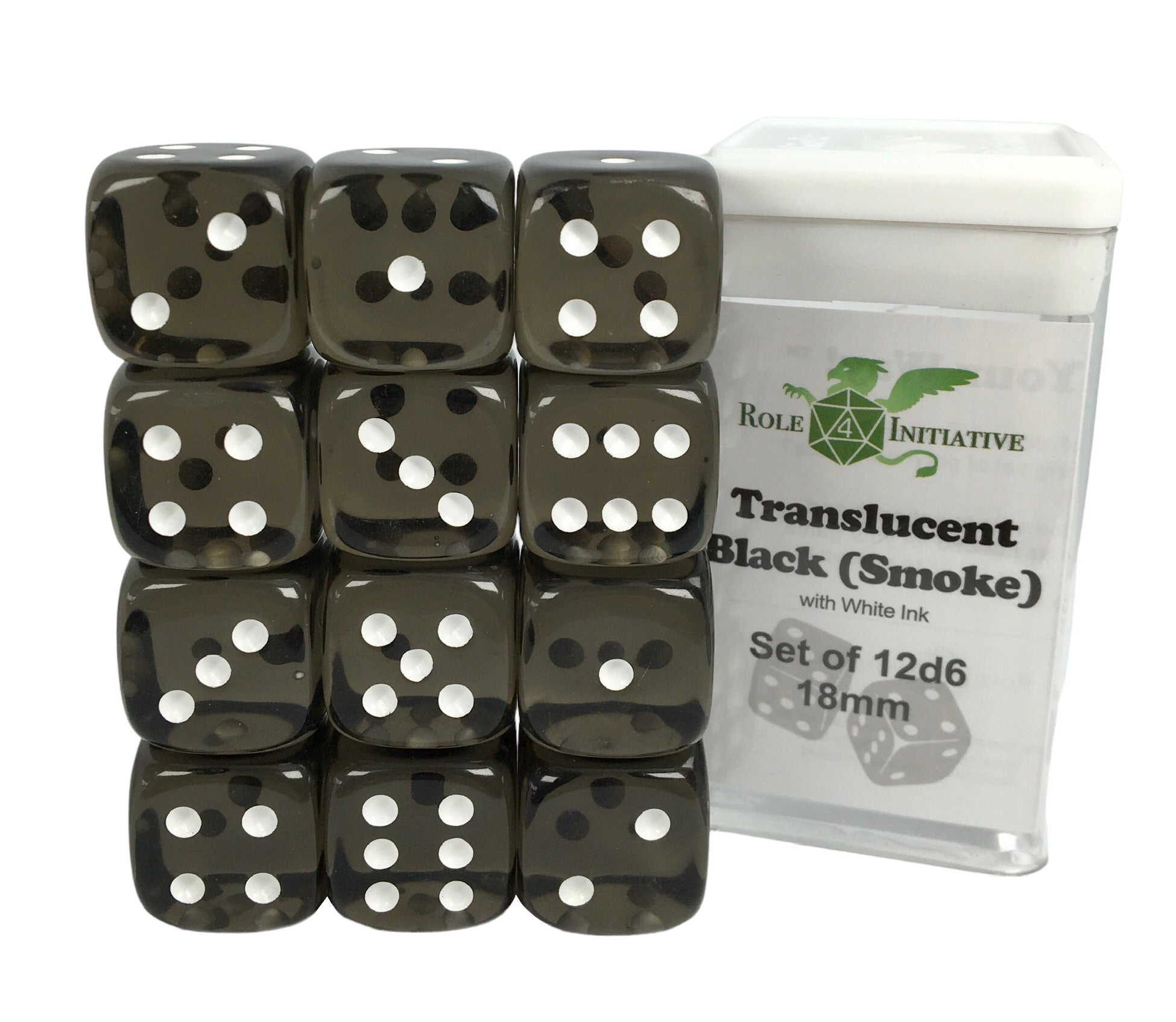 Translucent Black (Smoke) w/ White Ink - Set of 12d6 pips 18mm Dice