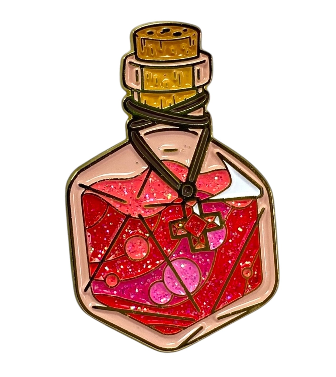 This 1.5"-tall glittering enamel pin depicts a d20-shaped health potion bottle in bubbling red and pink hues, with a healing red cross gem draped around the bottle's neck. The vibrant colors are dressed in iridescent glitter in the potion contents and on the red gem.